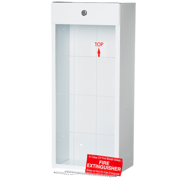 This surface-mounted metal fire extinguisher cabinet is designed to securely house a 10 lb ABC fire extinguisher. Constructed from durable materials, it features a keyed lock for authorized access and a clear viewing panel for easy visibility. The cabinet’s white enamel finish ensures it complements various interior settings while providing essential protection for your fire safety equipment.